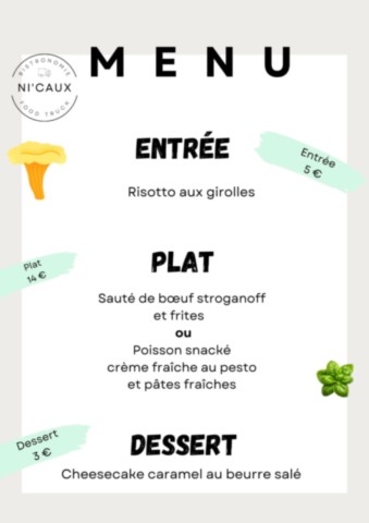 Ni'Caux Food Truck , vous propose des Menus Wrap que vous pourrez réserver au 06 25 75 09 62, pour un passage hebdomadaire (voir planning joint), mais est qualifié pour vous offrir des prestations de traiteur pour évènements. Il saura vous écouter et vous conseiller dans vos démarches festives et vous proposer un service de qualité. N'hésitez pas à le consulter. N'hésitez pas à consulter les menus "wrap" et les propositions traiteurs.